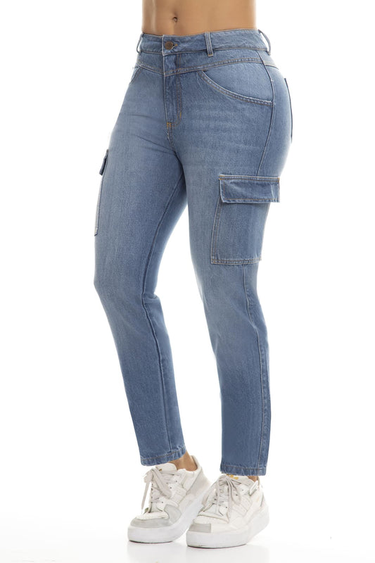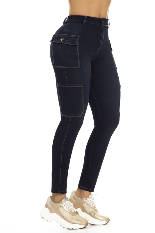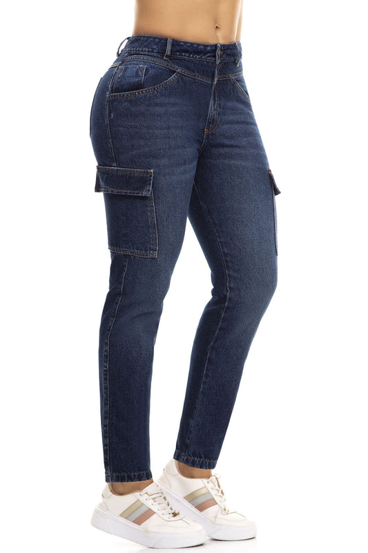 10068 Jean cargo stretch efecto levanta cola, tiro super alto color azul medio oscuro