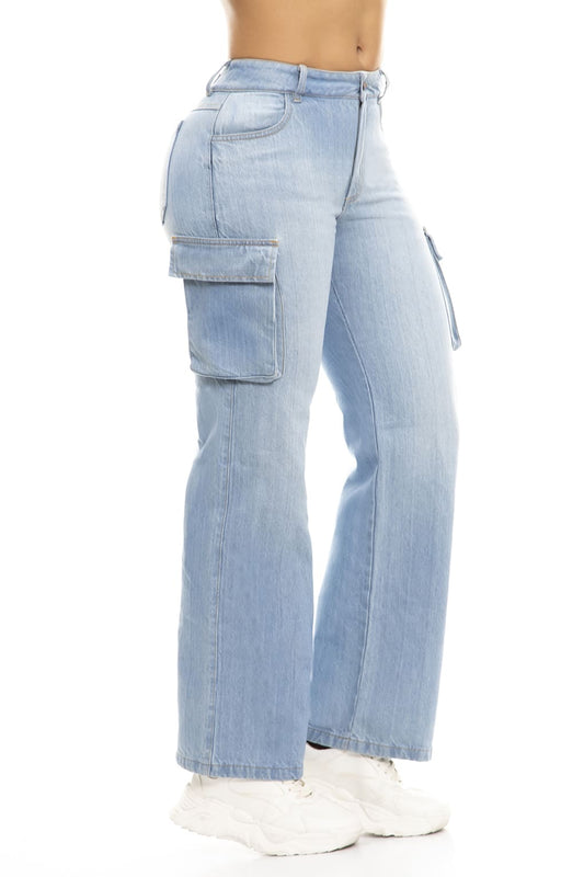 10097 Pantalón Cargo bota ancha, tiro alto, 100% algodón tono azul claro