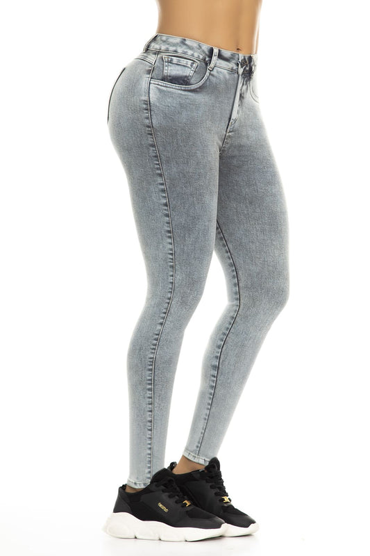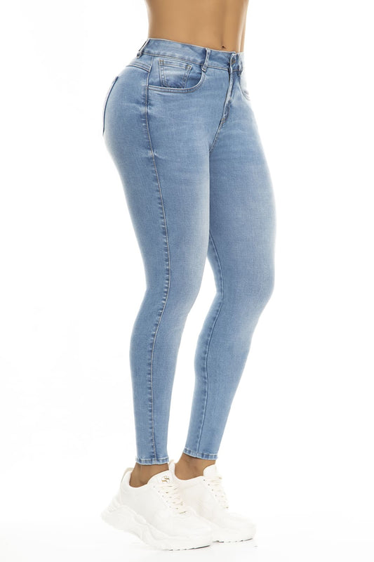Ref.10058 Jean Strech con faja interna,tiro súper alto, efecto push up, tono azul medio claro