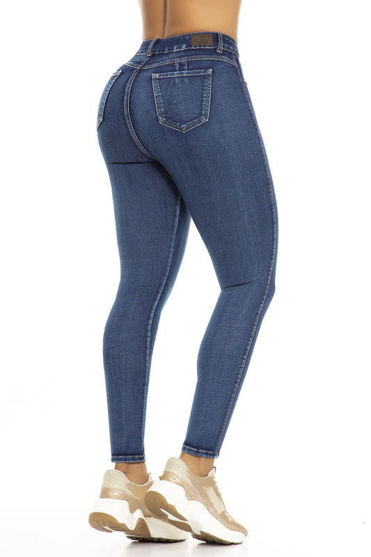 Ref. 10057 Jean Strech ,tiro súper alto, efecto push up, tono azul con satinados