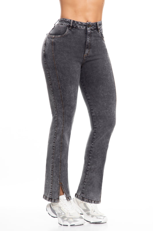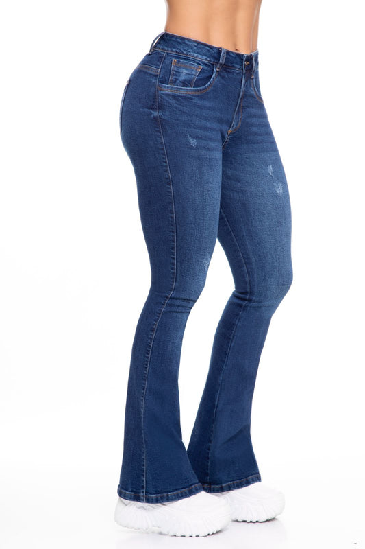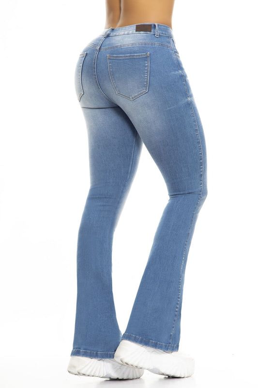 10106 Pantalón Flare bota ancha, stretch, tiro alto, tono azul medio