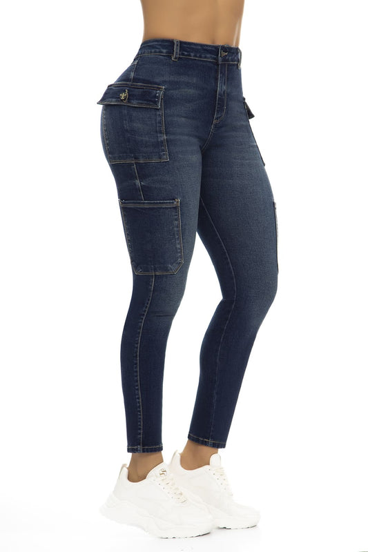 10068 Jean cargo stretch efecto levanta cola, tiro super alto color azul medio oscuro
