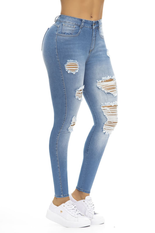 Ref. 10059 Jean Strech ,tiro súper alto, efecto push up, tono azul medio con rotos